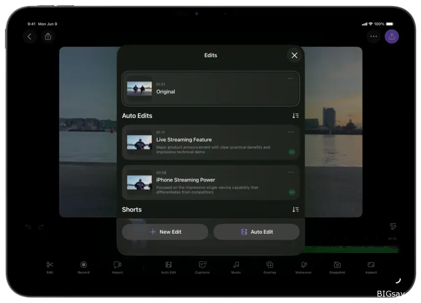 Видеоредактор с ИИ-функциями. Приложение автоматически находит удачные моменты, адаптирует ролики под нужные форматы, создаёт субтитры на разных языках и позволяет записывать видео с телесуфлёром.